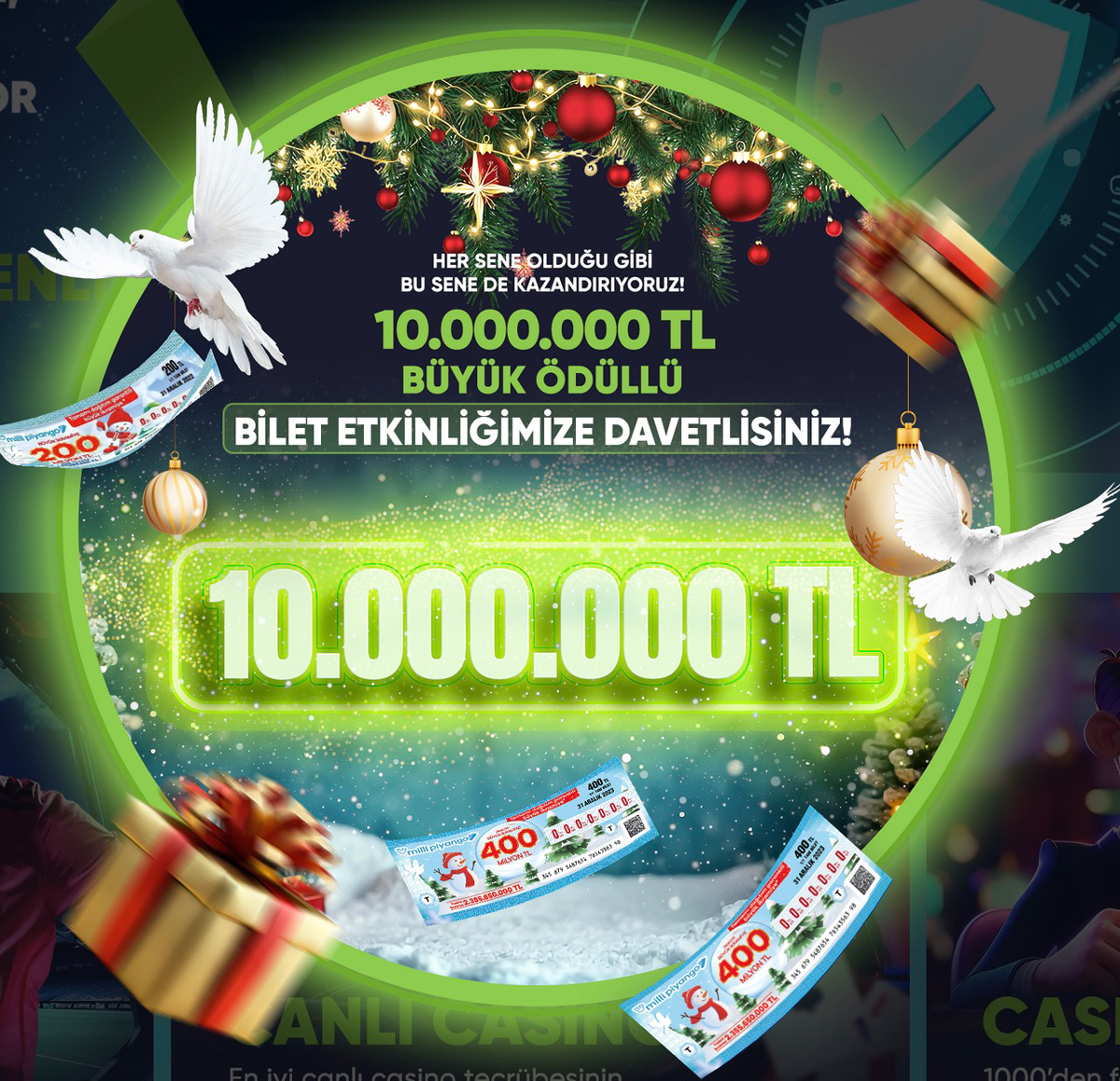 Görselde kullanılan ışıklı çerçeveler, kar efektleri, yılbaşı süsleri ve bilet görselleri – hepsi bir araya geldiğinde kullanıcıyı o anın içine taşıyor. Kendini sadece bir sitede değil, bir etkinliğin parçası gibi hissettiriyor.